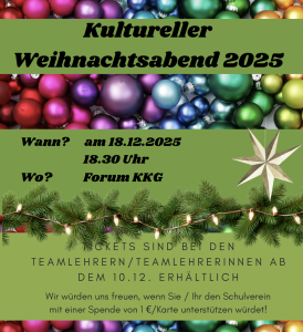 Unser diesjähriger Kultureller Weihnachtsabend findet am 18.12.2025 ab 18:30 Uhr statt. Wir laden Sie und Euch herzlich dazu ein!