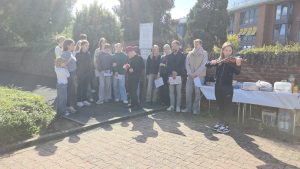 Nach der musikalischen Eröffnung berichteten die ProjektschülerInnen den interessierten TeilnehmerInnen über ihr besonderes Verhältnis zum jüdischen Friedhof. Hier ging es vor allem um das Engagement im Rahmen der Patenschaft, die der Projektgruppe im Jahr 2014 von der damaligen Bürgermeisterin Ursula Kwasny angetragen worden war.