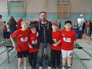 Unsere Ballstrategen konnten beim Bezirksentscheid des beliebten Tischtennisrundlaufturniers in Willich bis ins Viertelfinale einziehen; das gelang zuletzt im Jahr 2022. Entsprechend groß war die Freude bei der Mannschaft und Trainer Thomas Jentjens.