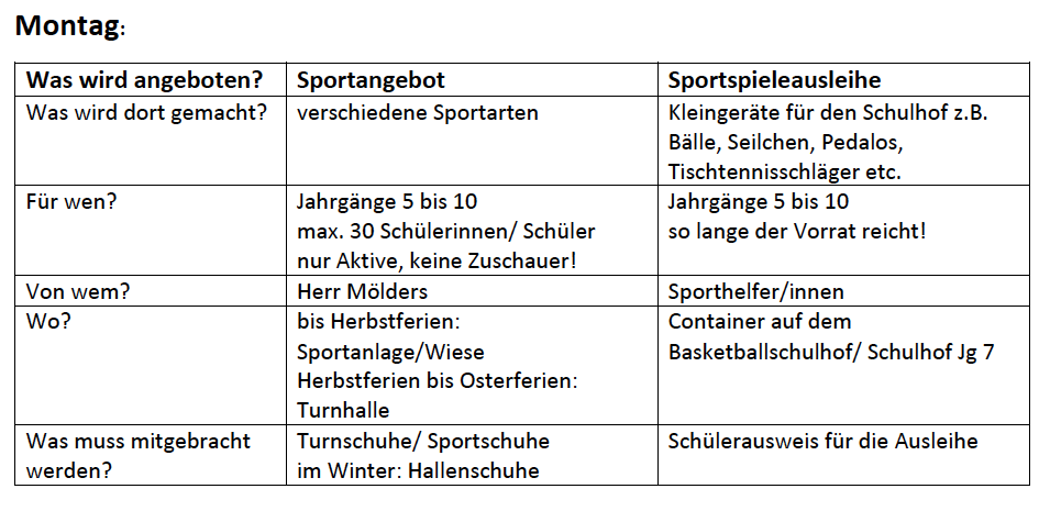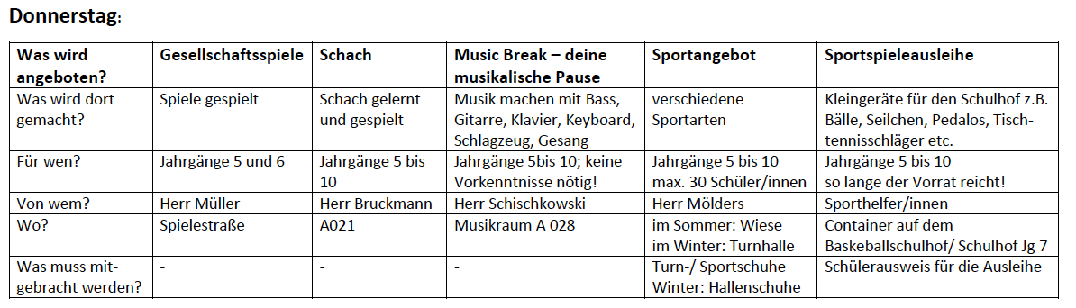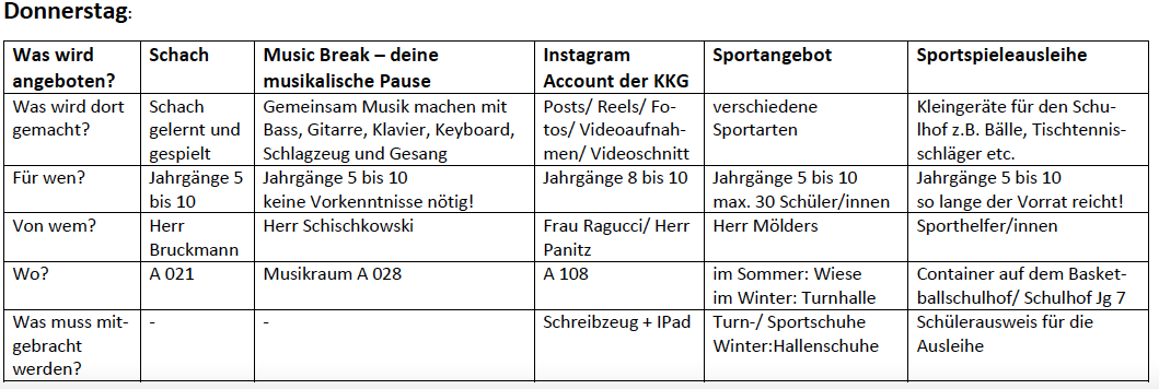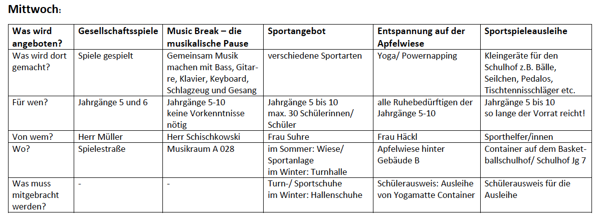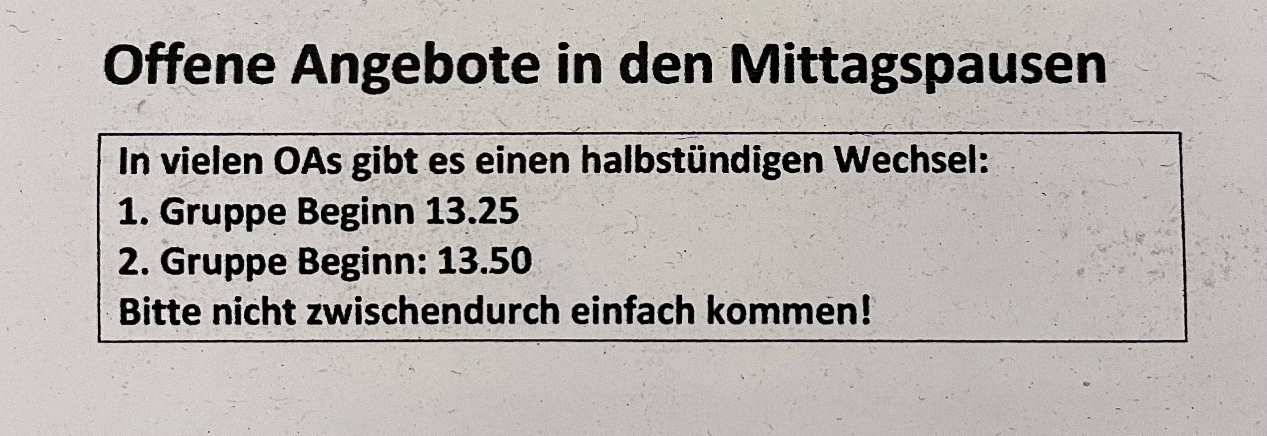 Hier werden unsere derzeit angebotenen OAs, die an unseren Langtagen Montag, Mittwoch und Donnerstag in der Mittagspause stattfinden, vorgestellt. Sie richten sich an die Schüler:innen der Abteilungen I (Jahrgang 5-7) und II (Jahrgang 8-10).