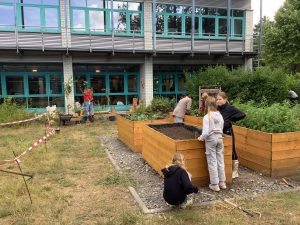 Die Gruppe Schulgarten bewegte in der Projektwoche Ende des vergangenen Schuljahres viel: Hochbeete wurden fertig befüllt, bepflanzt und eingesät, Himbeerstecklinge (Spenden einiger Lehrerinnen), einheimische Sträucher und Spalier-Obstbäume (von der Gärtnerei Nicolin) wurden gepflanzt. Außerdem wurde eine Wildblumenwiese angelegt, indem der Boden mit Sand abgemagert wurde. Dank der Pflege durch die Hausmeister und Sekretärinnen während der Sommerferien haben wir nun einen blühenden Garten, in dem es viel zu entdecken und einiges zu ernten gibt. Danke an alle, die mitangepackt haben, natürlich auch der AK Schulgarten! Weitere Projekte folgen.